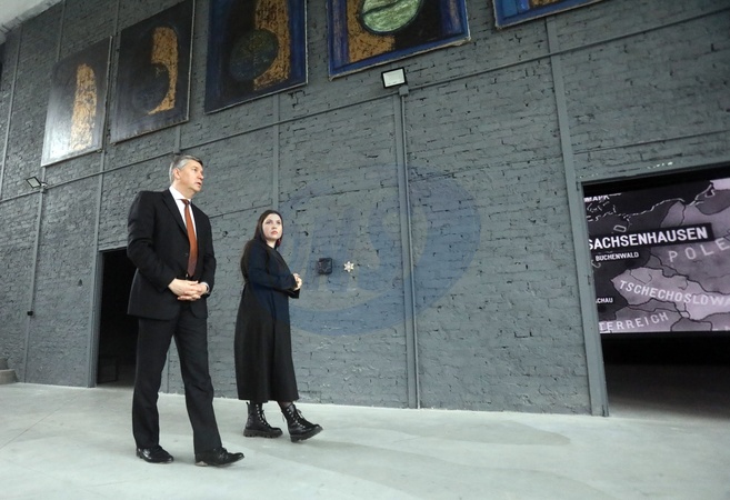 KYIV, UKRAINE - JANUARY 26, 2024 - Director of the Babyn Yar National Historical and Cultural Reserve Roza Tapanova and Acting Minister of Culture and Information Policy of Ukraine Rostyslav Karandieiev attend the opening of the exhibition project "Through the Living" dedicated to the International Holocaust Remembrance Day at the Living Memory Exhibition Center in Babyn Yar, Kyiv, capital of Ukraine., Credit:Yuliia Ovsiannikova / Avalon