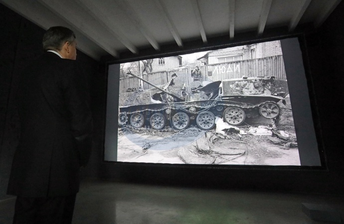 KYIV, UKRAINE - JANUARY 26, 2024 - Ukrainian artist Matvii Vaisberg and Acting Minister of Culture and Information Policy of Ukraine Rostyslav Karandieiev watches the footage of the video "War" by director Oleh Sosnov, photographer Oleksandr Hliadelov and composer Anton Baibakov, based on the chronicle of the first year of Russian invasion of Ukraine during the opening of the exhibition project "Through the Living" dedicated to the International Holocaust Remembrance Day at the Living Memory Exhibition Center in Babyn Yar, Kyiv, capital of Ukraine., Credit:Yuliia Ovsiannikova / Avalon