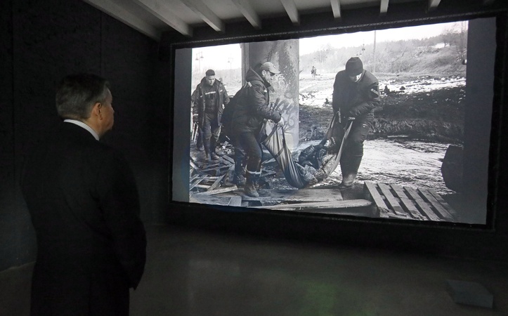 KYIV, UKRAINE - JANUARY 26, 2024 - Ukrainian artist Matvii Vaisberg and Acting Minister of Culture and Information Policy of Ukraine Rostyslav Karandieiev watches the footage of the video "War" by director Oleh Sosnov, photographer Oleksandr Hliadelov and composer Anton Baibakov, based on the chronicle of the first year of Russian invasion of Ukraine during the opening of the exhibition project "Through the Living" dedicated to the International Holocaust Remembrance Day at the Living Memory Exhibition Center in Babyn Yar, Kyiv, capital of Ukraine., Credit:Yuliia Ovsiannikova / Avalon