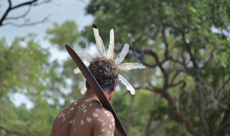 Indigenous Australian man holding traditional weapons during a ceremonial dance in Cape York Queensland Australia