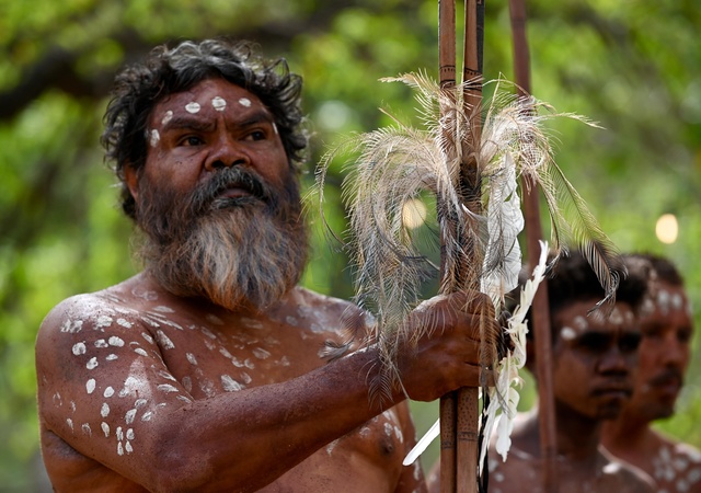 Indigenous Australian man holding traditional weapons during a ceremonial dance in Cape York Queensland Australia