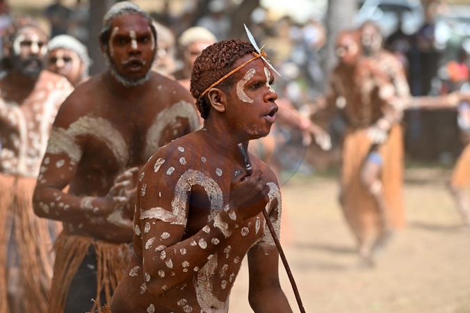 Indigenous Australian man holding traditional weapons during a ceremonial dance in Cape York Queensland Australia