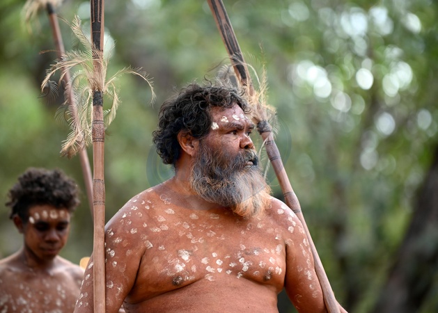 LAURA,QLD - JULY 08 2023:Indigenous Australian man holding traditional weapons during a ceremonial dance in Laura Quinkan Dance Festival Cape York Australia. Ceremonies combine dance, song, rituals, body decorations and costumes, Credit:Rafael Ben-Ari / Avalon
