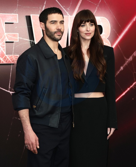 Tahar Rahim and Dakota Johnson at Madame Web photocall, London at Claridges in London, UK, on 31st January 2024, Credit:James Shaw / Avalon