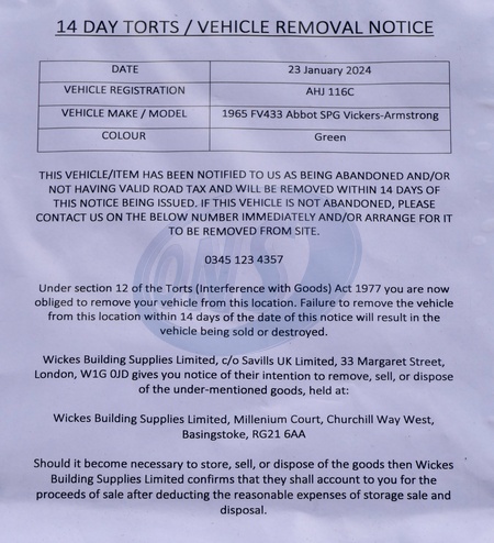 The 1963 decommissioned Abbot self propelled gun tank parked in protest outside the Wickes store in Basingstoke. A man who parked a tank in protest outside the Basingstoke Wickes store has been warned that it will be removed or destroyed, but he has vowed to keep it there.Paul Gibbons from nearby village Kingsclere parked the vehicle outside Wickes in Basingstoke in December in protest against the company which installed his kitchen in February 2023. The 63 year old has demanded a refund from Wickes for his poor quality £25,000 kitchen installation at his home, which he claims has been plagued with issues including mould under the sink, to badly fitting units with a poor finish, and one heavy drawer nearly collapsing on his dog.Mr Gibbons parked the huge vehicle a 1963 decommissioned Abbot self-propelled gun which he borrowed from a friend who lends it to people who want to protest against big companies. However, a sign has now been posted on the vehicle warning that it will be removed ‘within 14 days' of the date of the notice, Credit:Geoffrey Swaine / Avalon