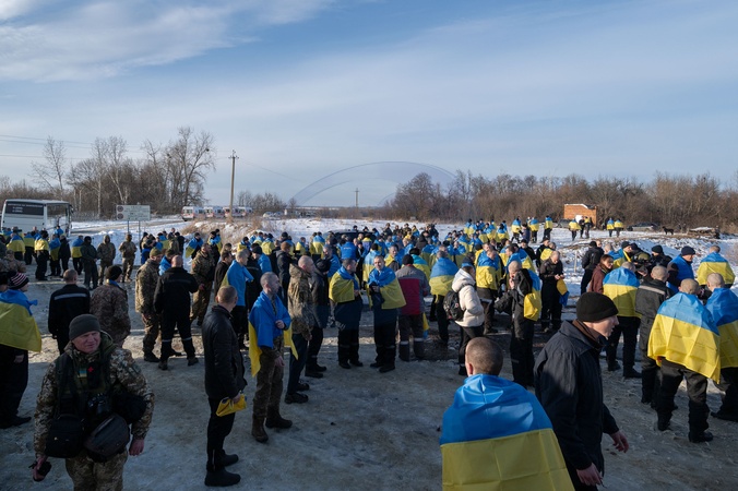 Des soldats ukrainiens de retour chez eux, à la suite d'un échange de prisonniers de guerre entre la Russie et l'Ukraine, le 31 janvier 2024. Cet échange était le 50ème retour de prisonniers de guerre et concernait 207 défenseurs ukrainiens. Ukrainian soldiers returning home, following a prisoner of war exchange between Russia and Ukraine, January 31, 2024. This exchange was the 50th return of prisoners of war and involved 207 Ukrainian defenders.