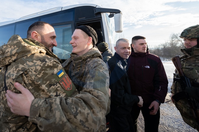 Des soldats ukrainiens de retour chez eux, à la suite d'un échange de prisonniers de guerre entre la Russie et l'Ukraine, le 31 janvier 2024. Cet échange était le 50ème retour de prisonniers de guerre et concernait 207 défenseurs ukrainiens. Ukrainian soldiers returning home, following a prisoner of war exchange between Russia and Ukraine, January 31, 2024. This exchange was the 50th return of prisoners of war and involved 207 Ukrainian defenders.
