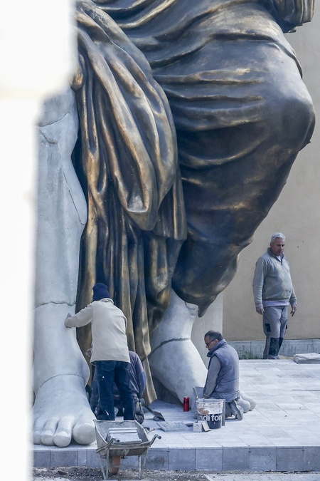 Rome, Musei Capitolini. - The colossus of Emperor Constantine was reconstructed by Fondazione Prada, Factum Foundation and the Capitoline museum. The statue, twelve meters high, arrived from Milan: the final installation work is underway and it will then be exhibited to the public next to the original fragments, ten in total. These include the face, the hand with the index finger also pointing towards the sky, the emperor's foot, the elbow. From these we started to create the reproduction of the statue which is a facsimile in polyurethane treated with layers of resin. But the most surprising thing is to discover that it was made with 3D printing.The reconstruction is a hypothesis by the historian and archaeologist Salvatore Settis, curator of the Recycling Beauty exhibition presented last year at the Prada Foundation in Milan, while the recomposition is by Factum Foundation for Digital Technology in Preservation. 01/02/2024, Credit:Riccardo De Luca / Avalon