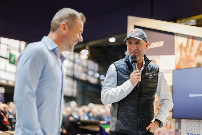 Sébastien Loeb fête ses 50 ans lors du salon Rétromobile 2024 au Paris Expo Porte de Versailles à Paris