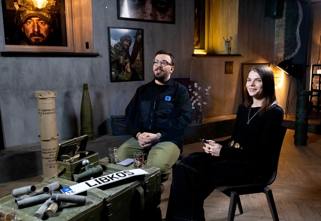 KYIV, UKRAINE - JANUARY 29, 2024 - Hosts Kostiantyn and Vlada Liberov are seen during the recording of the program "Kramatorsk Station" with Head of the press service of the Eastern Group of the Armed Forces of Ukraine Illia Yevlash, as a joint project between Ukrinform and the Center for Countering Disinformation, Kyiv, capital of Ukraine., Credit:Pavlo_Bagmut / Avalon
