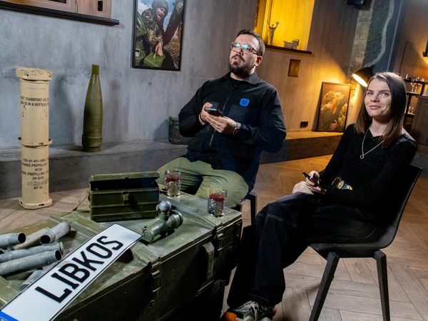 KYIV, UKRAINE - JANUARY 29, 2024 - Hosts Kostiantyn and Vlada Liberov are seen during the recording of the program "Kramatorsk Station" with a servicewoman of the National Guard of Ukraine Khrystyna, call sign "Kudriava", as a joint project between Ukrinform and the Center for Countering Disinformation, Kyiv, capital of Ukraine., Credit:Pavlo_Bagmut / Avalon