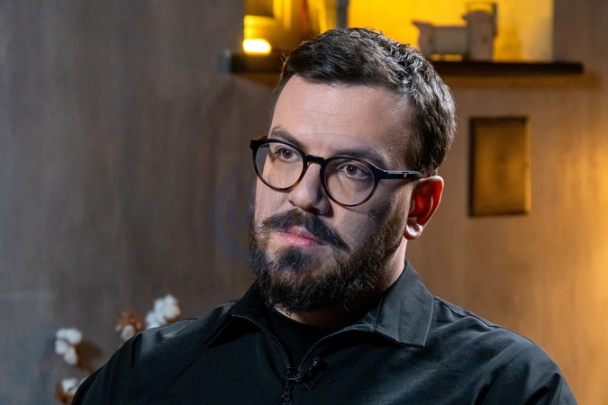 KYIV, UKRAINE - JANUARY 29, 2024 - Host Kostiantyn Liberov is seen during the recording of the program "Kramatorsk Station" with a servicewoman of the National Guard of Ukraine Khrystyna, call sign "Kudriava", as a joint project between Ukrinform and the Center for Countering Disinformation, Kyiv, capital of Ukraine., Credit:Pavlo_Bagmut / Avalon