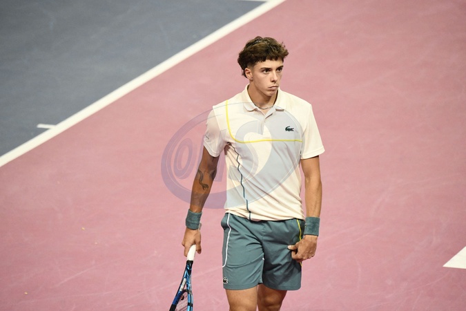 MONTPELLIER, FRANCE - FEBRUARY 1 : Arthur CAZAUX (FRA) during the 2nd round of the ATP 250 Open Sud de France tournament vs. Felix AUGER-ALIASSIME (CAN) in Montpellier, France on February 1st, 2024.