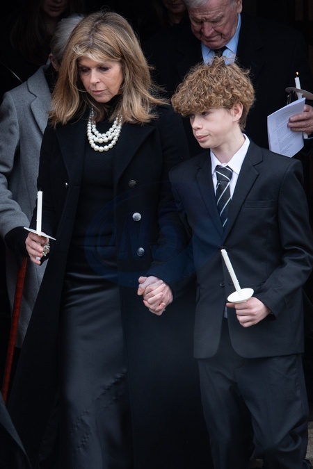 Kate Garraway and son Billy Draper at husband Derek Draper's funeral service at Church of St Mary The Virgin, Primrose Hill, London, England, UK on Friday 2 February, 2024., Credit:Justin Ng / Avalon