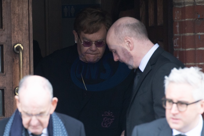 Sir Elton John and husband David Furnish at Derek Draper's funeral service at Church of St Mary The Virgin, Primrose Hill, London, England, UK on Friday 2 February, 2024., Credit:Justin Ng / Avalon