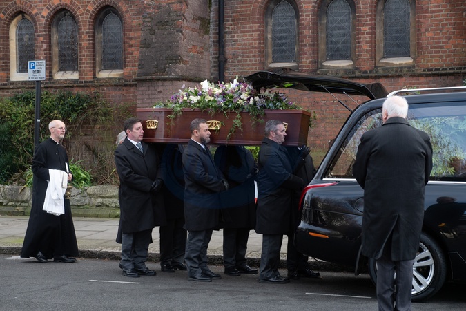 The coffin of Derek Draper is placed into a hearse at his funeral service at Church of St Mary The Virgin, Primrose Hill, London, England, UK on Friday 2 February, 2024., Credit:Justin Ng / Avalon