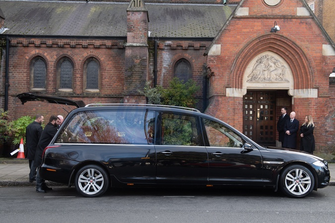 The coffin of Derek Draper is placed into a hearse at his funeral service at Church of St Mary The Virgin, Primrose Hill, London, England, UK on Friday 2 February, 2024., Credit:Justin Ng / Avalon