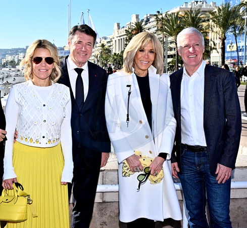 Laura Tenoudji Estrosi, son mari Christian Estrosi, le maire de Nice, la Première dame française, Brigitte Macron (présidente de la Fondation Hôpitaux de Paris-Hôpitaux de France), et le sélectionneur de l'équipe de France de football, Didier Deschamps (parrain de l'opération Pièces Jaunes), durant la clôture de l'édition 2024 de la 35eme Opération Pièces Jaunes à Nice, au kiosque à musique du jardin Albert 1er, le 2 février 2024. Cette collecte de fonds "Pièces Jaunes" est destinée à améliorer la vie des enfants hospitalisés. © Bruno Bebert/Bestimage Closing of the ‘Pièces Jaunes' event in Nice, France, le 3 février 2024.