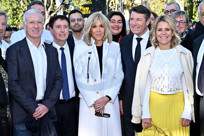 Le sélectionneur de l'équipe de France de football, Didier Deschamps (parrain de l'opération Pièces Jaunes), le docteur Hervé Cael, conseiller municipal de Nice et vice-président du conseil de surveillance du CHU de Nice, la Première dame française, Brigitte Macron (présidente de la Fondation Hôpitaux de Paris-Hôpitaux de France), Christian Estrosi, le maire de Nice, et sa femme, Laura Tenoudji Estrosi durant la clôture de l'édition 2024 de la 35eme Opération Pièces Jaunes à Nice, au kiosque à musique du jardin Albert 1er, le 2 février 2024. Cette collecte de fonds "Pièces Jaunes" est destinée à améliorer la vie des enfants hospitalisés. © Bruno Bebert/Bestimage Closing of the ‘Pièces Jaunes' event in Nice, France, le 3 février 2024.