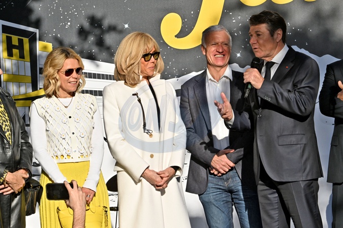 Laura Tenoudji Estrosi, la Première dame française, Brigitte Macron (présidente de la Fondation Hôpitaux de Paris-Hôpitaux de France), le sélectionneur de l'équipe de France de football, Didier Deschamps (parrain de l'opération Pièces Jaunes), et Christian Estrosi, le maire de Nice, durant la clôture de l'édition 2024 de la 35eme Opération Pièces Jaunes à Nice, au kiosque à musique du jardin Albert 1er, le 2 février 2024. Cette collecte de fonds "Pièces Jaunes" est destinée à améliorer la vie des enfants hospitalisés. © Bruno Bebert/Bestimage Closing of the ‘Pièces Jaunes' event in Nice, France, le 3 février 2024.