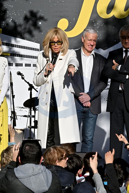 La Première dame française, Brigitte Macron (présidente de la Fondation Hôpitaux de Paris-Hôpitaux de France), et le sélectionneur de l'équipe de France de football, Didier Deschamps (parrain de l'opération Pièces Jaunes), durant la clôture de l'édition 2024 de la 35eme Opération Pièces Jaunes à Nice, au kiosque à musique du jardin Albert 1er, le 2 février 2024. Cette collecte de fonds "Pièces Jaunes" est destinée à améliorer la vie des enfants hospitalisés. © Bruno Bebert/Bestimage Closing of the ‘Pièces Jaunes' event in Nice, France, le 3 février 2024.