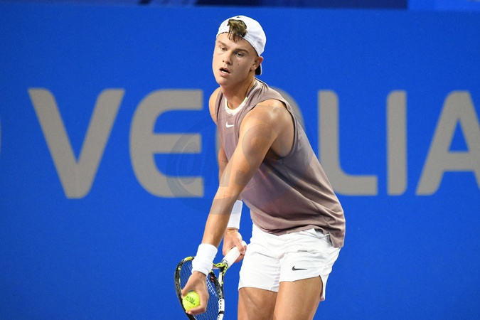 Tournoi de tennis Open Sud de France à Montpellier le 2 février 2024. © Valentina Claret / Panoramic / Bestimage MONTPELLIER, FRANCE - FEBRUARY 2 : Michael MMOH (USA) during the 1/4 final of the ATP 250 Open Sud de France tournament vs. Holger RUNE (DEN) in Montpellier, France on February 2nd, 2024.