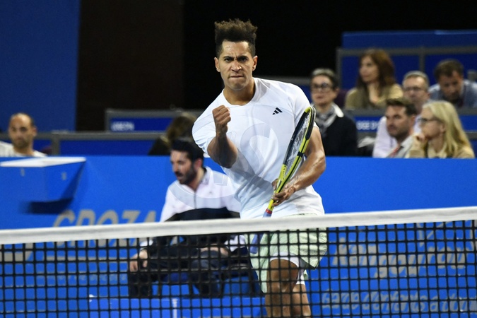 Tournoi de tennis Open Sud de France à Montpellier le 2 février 2024. © Valentina Claret / Panoramic / Bestimage MONTPELLIER, FRANCE - FEBRUARY 2 : Michael MMOH (USA) celebration during the 1/4 final of the ATP 250 Open Sud de France tournament vs. Holger RUNE (DEN) in Montpellier, France on February 2nd, 2024.
