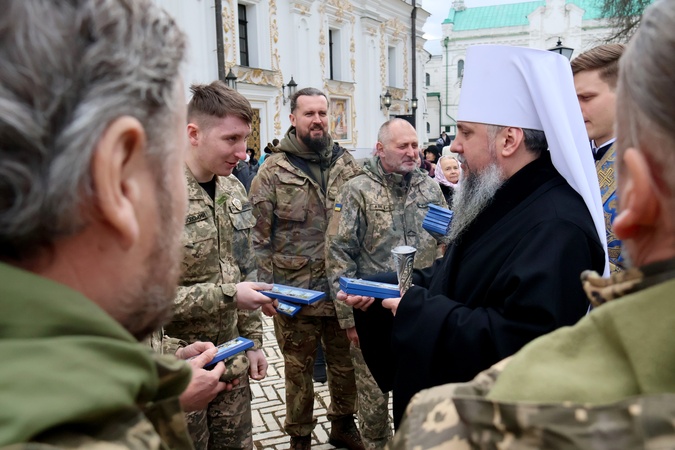 KYIV, UKRAINE - FEBRUARY 2, 2024 - Primate of the Orthodox Church of Ukraine, Metropolitan of Kyiv and All Ukraine His Beatitude Epiphanius (R) meets servicemen after a divine liturgy at the Dormition Cathedral of the Kyiv-Pechersk Lavra on Candlemas, Kyiv, capital of Ukraine., Credit:Pavlo_Bagmut / Avalon
