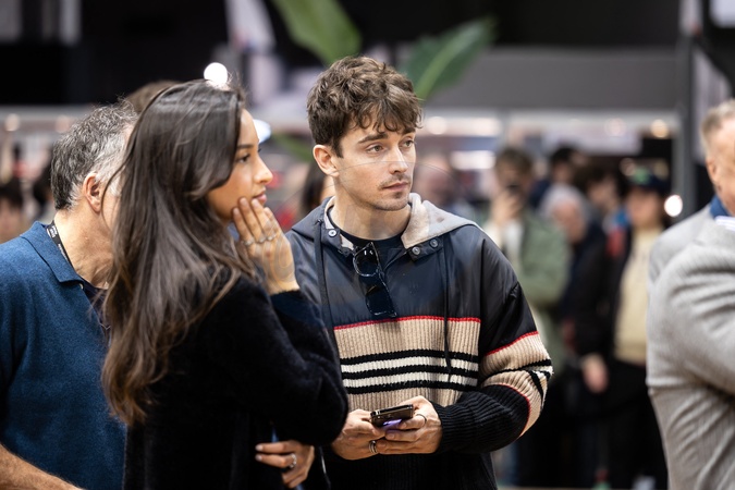 Le pilote Charles Leclerc et sa compagne Alexandra Saint Mleux font un passage au salon Rétromobile 2024 à Paris