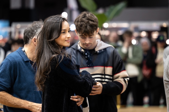 Le pilote Charles Leclerc et sa compagne Alexandra Saint Mleux font un passage au salon Rétromobile 2024 à Paris