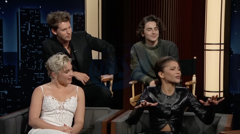 Pictures MUST credit: ABC The cast of new sci-fi sequel Dune : Part Two revealed secrets about themselves in a game of true or false. And it was revealed that 28-year-old British actress Florence Pugh's mother got high with rapper Snoop Dog at the Oscars. And that US starlet Zendaya , 27, had to repeat a year in kindergarten because she got behind on reading and writing. Also Elvis movie heartthrob Austin Butler, 32, got talent scouted at a country fair. Finally Wonka actor Timothee Chalamet , 28, has a rapping alter ego known as Little Timmy True. The game came about on the Jimmy Kimmel US talk show because he wanted to know how much the cast had learned about each other shooting the Dune film, set on a futuristic sand-covered planet. Kimmel explained:” You guys spend a lot of time together I thought maybe we'd play this game.” He handed out paddles with the word "true” on one side and "false” on the other, along with a picture of the jaws of a giant sand worm which appears in the film. Picture supplied by JLPPA