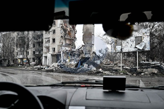 ORIKHIV, UKRAINE - JANUARY 27, 2024 - A section of a nine-storey apartment building destroyed as a result of a KAB (Russian precision-guided munition) strike is seen through the windscreen in frontline Orikhiv, Zaporizhzhia region, southeastern Ukraine., Credit:Dmytro Smolienko / Avalon
