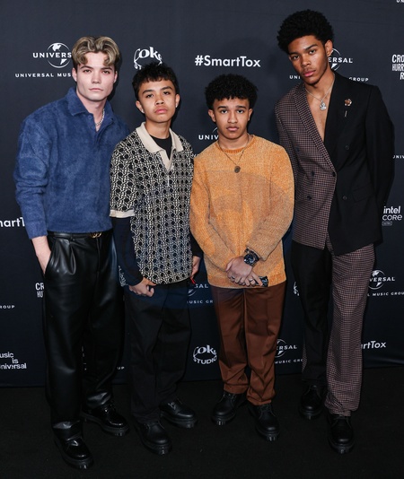 HOLLYWOOD, LOS ANGELES, CALIFORNIA, USA - FEBRUARY 04: Connor Finnerty, AJ Boogie, Cameron J. Wright, YM Collier and Rahja Fuller of Pop Money arrive at Universal Music Group's 2024 66th GRAMMY Awards After Party held at nya studios WEST on February 4, 2024 in Hollywood, Los Angeles, California, United States., Credit:Xavier Collin / Avalon