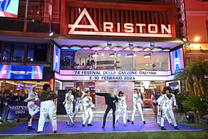 Alessia Marcuzzi with the dancers in front of Ariston Theater, 05/02/2024, Credit:Maria Laura Antonelli / Avalon