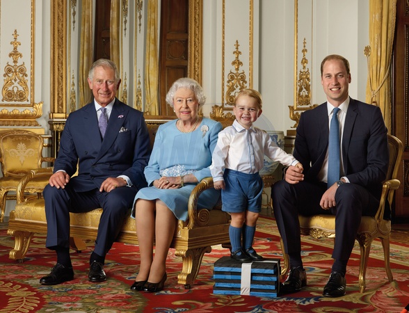 La reine Elisabeth II a posé, à l'occasion de son 90ème anniversaire, avec son fils le prince Charles, son petit-fils le prince William et son arrière petit-fils le prince George, pour quatre nouveaux timbres de la Royal Mail, au palais de Buckingham à Londres. (L-R) Prince Charles, Prince of Wales, Queen Elizabeth II, Prince George and Prince William, Duke of Cambridge pose during a Royal Mail photoshoot for a stamp sheet to mark the 90th birthday of Queen Elizabeth II in the White Drawing Room at Buckingham Palace in the summer of 2015 in London, England.
