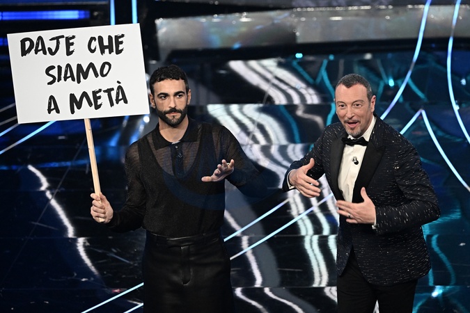 Marco Mengoni and Amadeus during Sanremo Italian Song Festival. Sanremo, Italy, 06 February 2024., Credit:Maria Laura Antonelli / Avalon