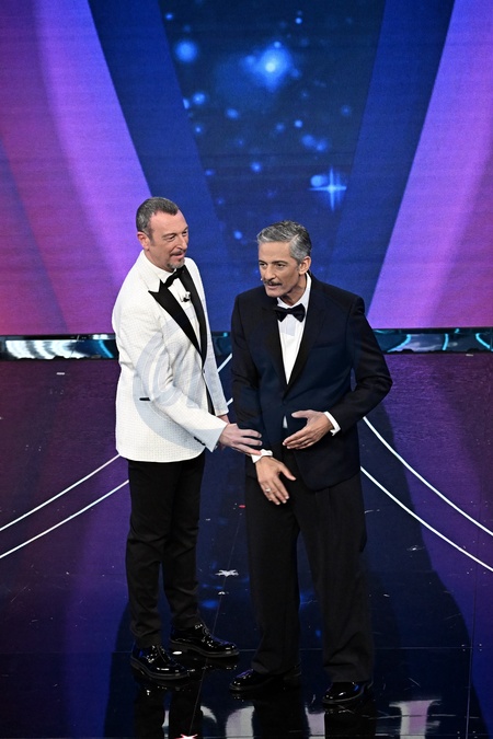 Amadeus and Fiorello during Sanremo Italian Song Festival. Sanremo, Italy, 06 February 2024., Credit:Maria Laura Antonelli / Avalon