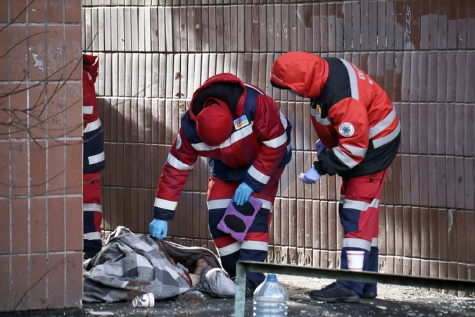 KYIV, UKRAINE - FEBRUARY 7, 2024 - Paramedics examine the body of a resident who died in a block of flats in the Holosiivskyi district hit by falling Russian missile debris as seen after the Russian attack on Ukraine on Wednesday morning, February 7, Kyiv, capital of Ukraine., Credit:Eugen Kotenko / Avalon