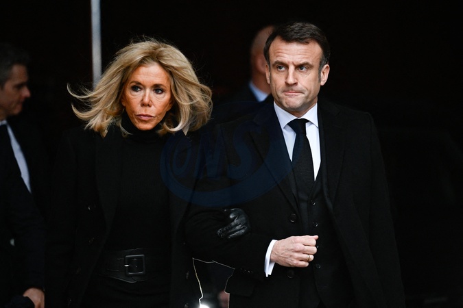 Le président de la République française Emmanuel Macron et sa femme la Première Dame Brigitte Macron - Cérémonie d'hommage national aux victimes françaises des attaques terroristes du 7 octobre en Israël dans la cour d'honneur de l'Hôtel national des Invalides, à Paris, France, le 7 février 2024. Quatre mois jour pour jour après les attentats terroristes qui ont frappé Israël et le peuple israélien et qui ont causé la mort de 42 de nos concitoyens. A ce jour, trois de nos compatriotes demeurent toujours disparus et présumés otages, et la France n'a de cesse d'œuvrer avec ses partenaires pour leur libération. ©Eric Tschaen/Pool/Bestimage Ceremony of national homage to the French victims of the terrorist attacks in Israel on 7 October in the Cour d'Honneur of the Hôtel National des Invalides on 7 February 2024. Four months to the day after the terrorist attacks that struck Israel and the Israeli people, killing 42 of our fellow citizens. To this day, three of our compatriots remain missing and presumed hostages, and France continues to work with its partners for their release.