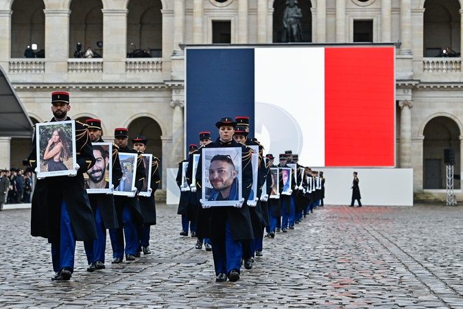 Narodowa ceremonia oddania hołdu francuskim ofiarom ataków terrorystycznych z 7 października w Izraelu na głównym dziedzińcu Hôtel National des Invalides”