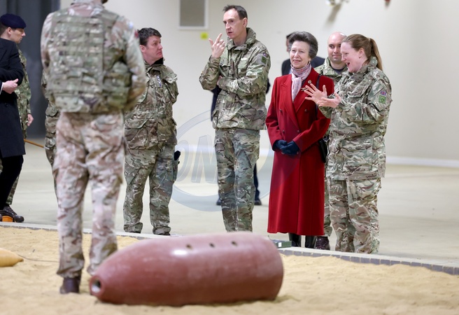 Bicester, UK, 07 February 2024: Britain's Princess Anne, Princess Royal speaks with military personnel as she views a demonstration in the indoor training area during her visit to the Defence Explosive Ordnance Disposal Training Regiment at St George's Barracks in Bicester, UK. The Princess Royal is Colonel in Chief of The Royal Logistical Corps., Credit:Chris Jackson / Avalon
