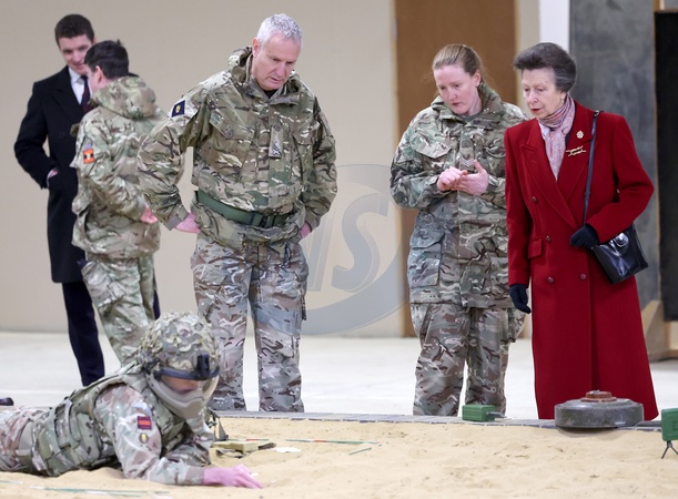 Bicester, UK, 07 February 2024: Britain's Princess Anne, Princess Royal speaks with military personnel as she views a demonstration in the indoor training area during her visit to the Defence Explosive Ordnance Disposal Training Regiment at St George's Barracks in Bicester, UK. The Princess Royal is Colonel in Chief of The Royal Logistical Corps., Credit:Chris Jackson / Avalon