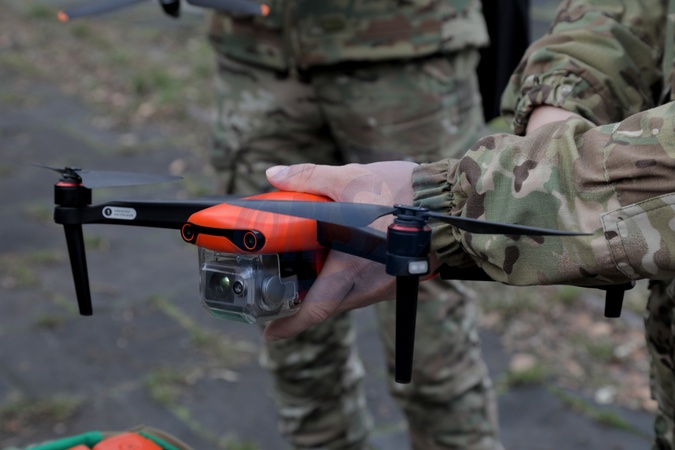 ODESA, UKRAINE - FEBRUARY 07, 2024 - A UAV is seen in the hands of a serviceman who takes a course at the Free Air drone training school, Odesa, southern Ukraine., Credit:Nina Liashonok / Avalon