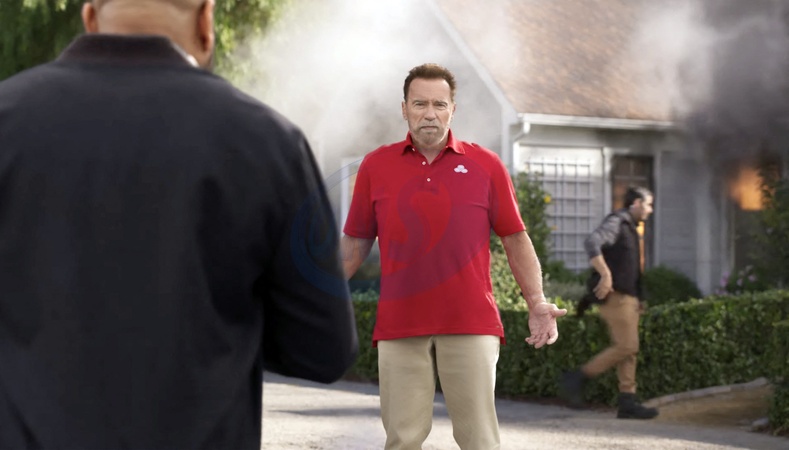 Pictures MUST credit: State Farm Movie tough guy Arnold Schwarzenegger comes to the rescue in a stunt-loaded commercial — but can't get his tongue around the word "neighbour.” The tongue-in-cheek ad, for US insurance company State Farm, is part one of two ads made for broadcasting during Sunday's Super Bowl (Feb 11). He saves two puppies from a house fire, flies a helicopter, carries a pregnant woman to safety and parachutes into a field of sheep. Each scene requires Austrian-born Terminator star Arnie, 76, to say , "like a good neighbour, State Farm is there.” But instead of saying the word "neighbour” ,his accent means that each time he pronounces it "neigh-baaa” The director and a set assistant keep trying to help Arnie with his pronunciation. The ad ends with the director handing him a script which has a dialogue change. The new script version of the commercial will be aired for the first time during the Super Bowl. Picture supplied by JLPPA