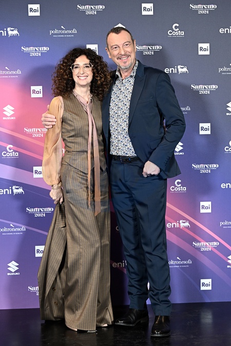 Teresa Mannino and Amadeus, the hosts of the third day of the Sanremo Festival, during the photocall., Credit:Maria Laura Antonelli / Avalon