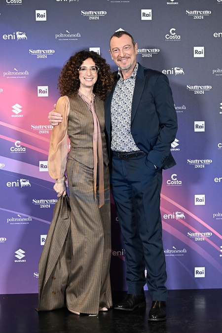 Teresa Mannino and Amadeus, the hosts of the third day of the Sanremo Festival, during the photocall., Credit:Maria Laura Antonelli / Avalon