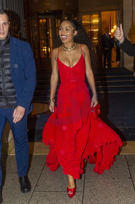 Yara Shahidi à la sortie de l'hôtel Ritz pour se rendre au dîner Cartier à Paris, FGrance, le 7 février 2024. Celebrities at the exit of the Ritz hotel to go to the Cartier dinner in Paris, France, on February 7, 2024.