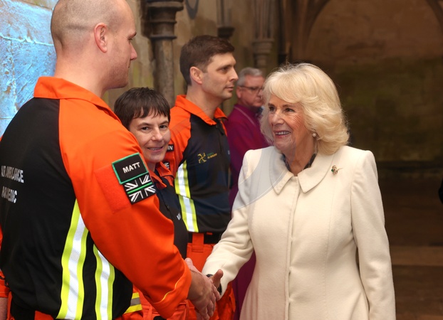SALISBURY, ENGLAND - FEBRUARY 08: Queen Camilla is greeted by air ambulance charity reps during a musical evening at Salisbury Cathedral on February 08, 2024 in Salisbury, England. The evening is being held to celebrate the work of local charities including The Wiltshire Bobby Van Trust, The Wiltshire Air Ambulance, Community First ‚Äě Youth Action Wiltshire and the regimental charities of The Grenadier Guards and The Rifles., Credit:Chris Jackson / Avalon