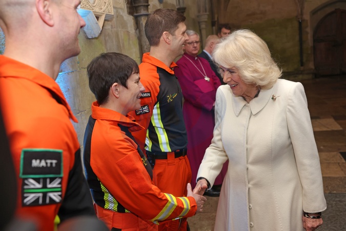 SALISBURY, ENGLAND - FEBRUARY 08: Queen Camilla is greeted by air ambulance charity reps during a musical evening at Salisbury Cathedral on February 08, 2024 in Salisbury, England. The evening is being held to celebrate the work of local charities including The Wiltshire Bobby Van Trust, The Wiltshire Air Ambulance, Community First ‚Äě Youth Action Wiltshire and the regimental charities of The Grenadier Guards and The Rifles., Credit:Chris Jackson / Avalon