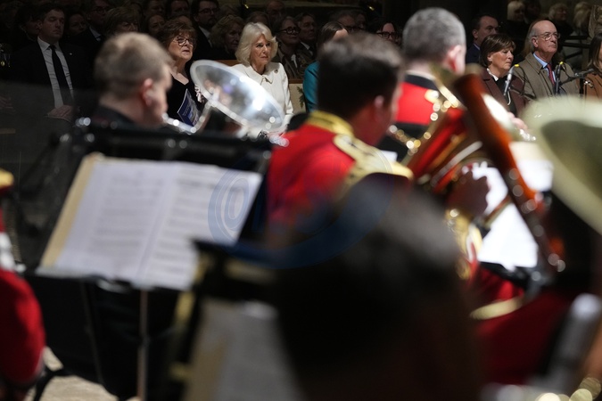 Britain's Queen Camilla, top centre, attends a Musical Evening at Salisbury Cathedral, Salisbury, England, Thursday, Feb. 8, 2024, to celebrate the work of local charities., Credit:Kirsty Wigglesworth / Avalon